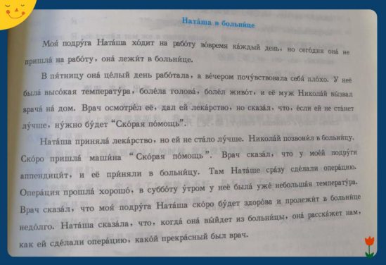 娜塔莎服了藥,但是她沒有感到好轉。尼古拉給醫院打了電話。很快就來了一輛救護車。醫生說,我朋友得的是闌尾炎,于是接收她住院治療。在那里馬上給娜塔莎做了手術。手術很順利,星期六早上她已經不發燒了。醫生說,我的朋友娜塔莎很快就會康復,住院的時間不會太長。娜塔莎說,她出院以后會給我們講講醫生是怎樣給她做手術的,醫生是多么的出色。