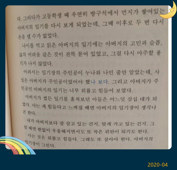 小時候,我以為日記的主人公是我和姐姐,而實際上爸爸才應該是日記的主人公。而且,日記中的爸爸看起來異常孤單疲憊。那個曾經偷看爸爸日記的兒子現在也已經30多歲了,每當我為生活而感到疲憊的時候,我都會想起爸爸的日記。